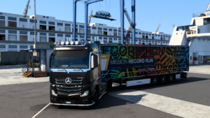 https://blog.scssoft.com/2023/10/krone-trailers-mission-record-run.htmlによると、クローネとトレーラーダイナミクス社が提携して電動モーター付きトレーラーを開発、そこに乗っかったSCSが電動トレーラーの実装はまだ無理だけどMission Record Runのペイントジョブだけは実装したよ!SSをSNSに投稿すると何か貰えるかもよ! という事らしい。